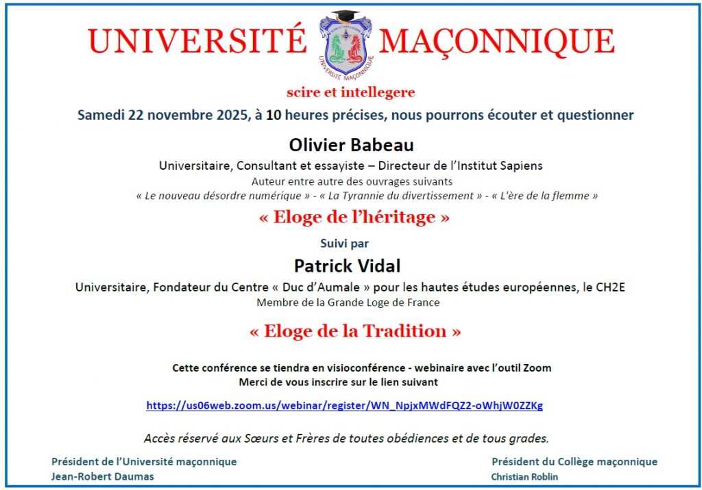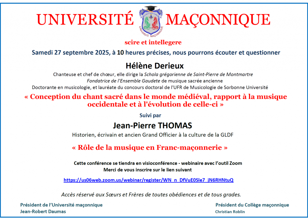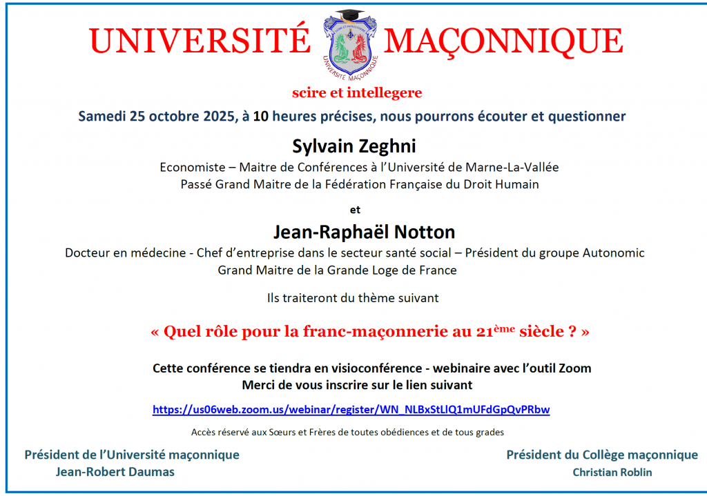Invitations Université maçonnique Université maçonnique Cycle 2024-2025 Cycle 2023-2024 Cycle 2022-2023 Programme du 4ème trimestre 2021